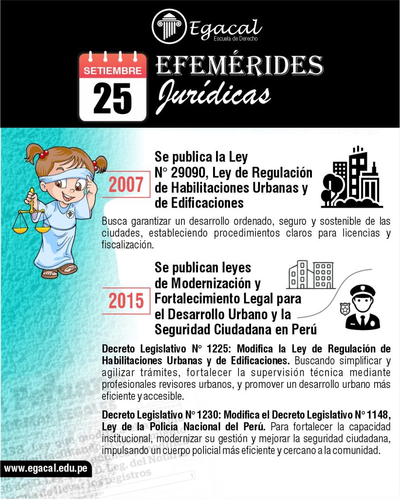 - Decreto Legislativo N° 1225: Modifica la Ley de Regulación de Habilitaciones Urbanas y de Edificaciones. Buscando simplificar y agilizar trámites, fortalecer la supervisión técnica mediante profesionales revisores urbanos, y promover un desarrollo urbano más eficiente y accesible.