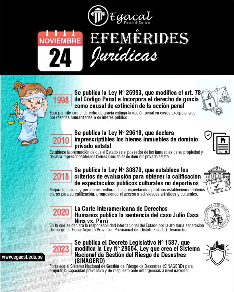 📌 24 DE NOVIEMBRE DE 1998: Se publica la Ley N° 26993, modifica el artículo 78 del Código Penal e Incorpora el derecho de gracia como causal de extinción de la acción penal. Permite que el derecho de gracia extinga la acción penal en casos excepcionales por razones humanitarias o de interés público.