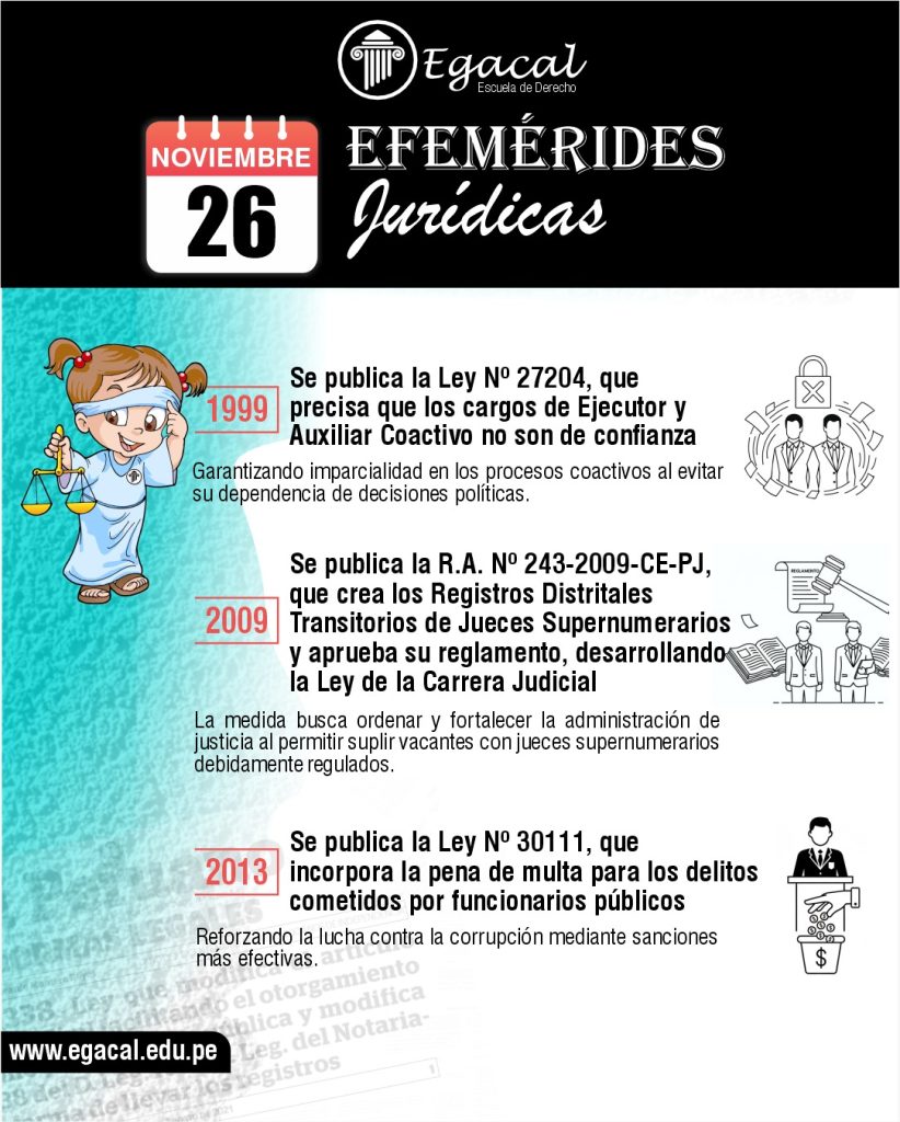 📌 26 DE NOVIEMBRE 1999: Se publica la Ley Nº 27204, que precisa que los cargos de Ejecutor y Auxiliar Coactivo no son de confianza, garantizando imparcialidad en los procesos coactivos al evitar su dependencia de decisiones políticas.