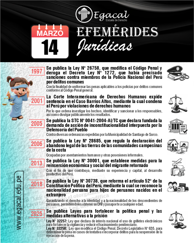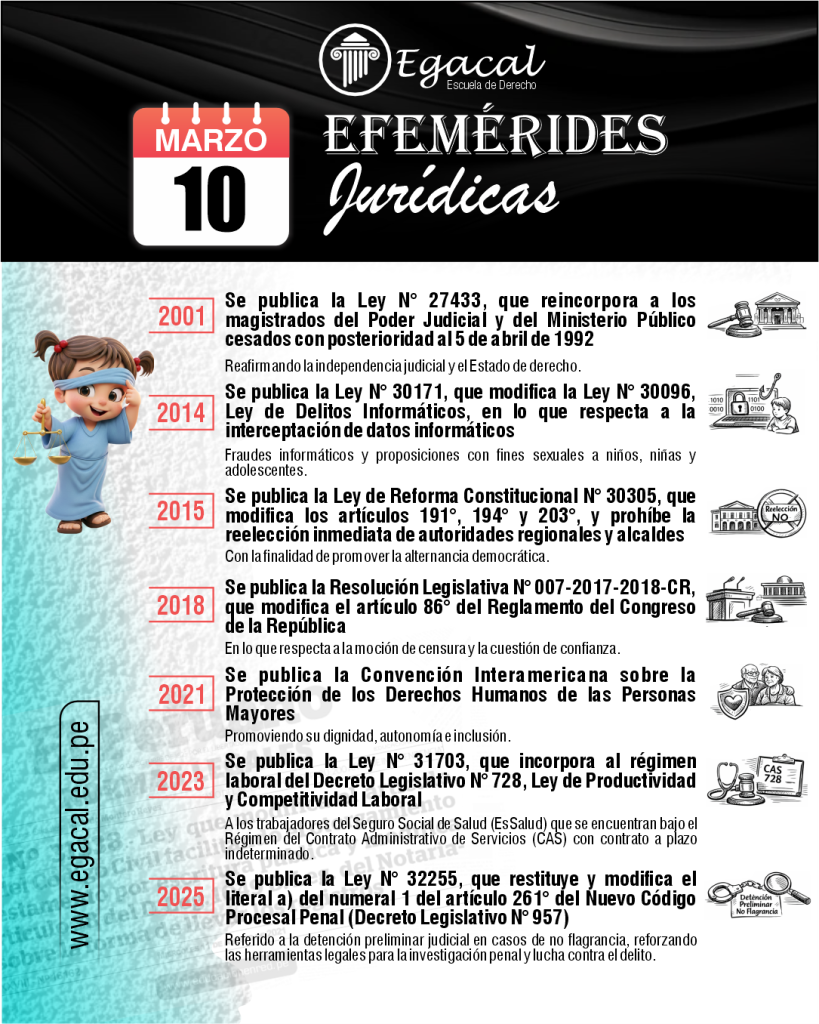 ๐ 2025: Se publica la Ley Nยฐ 32255, que restituye y modifica el literal a) del numeral 1 del artรญculo 261ยฐ del Nuevo Cรณdigo Procesal Penal (Decreto Legislativo Nยฐ 957), referido a la detenciรณn preliminar judicial en casos de no flagrancia, reforzando las herramientas legales para la investigaciรณn penal y lucha contra el delito.