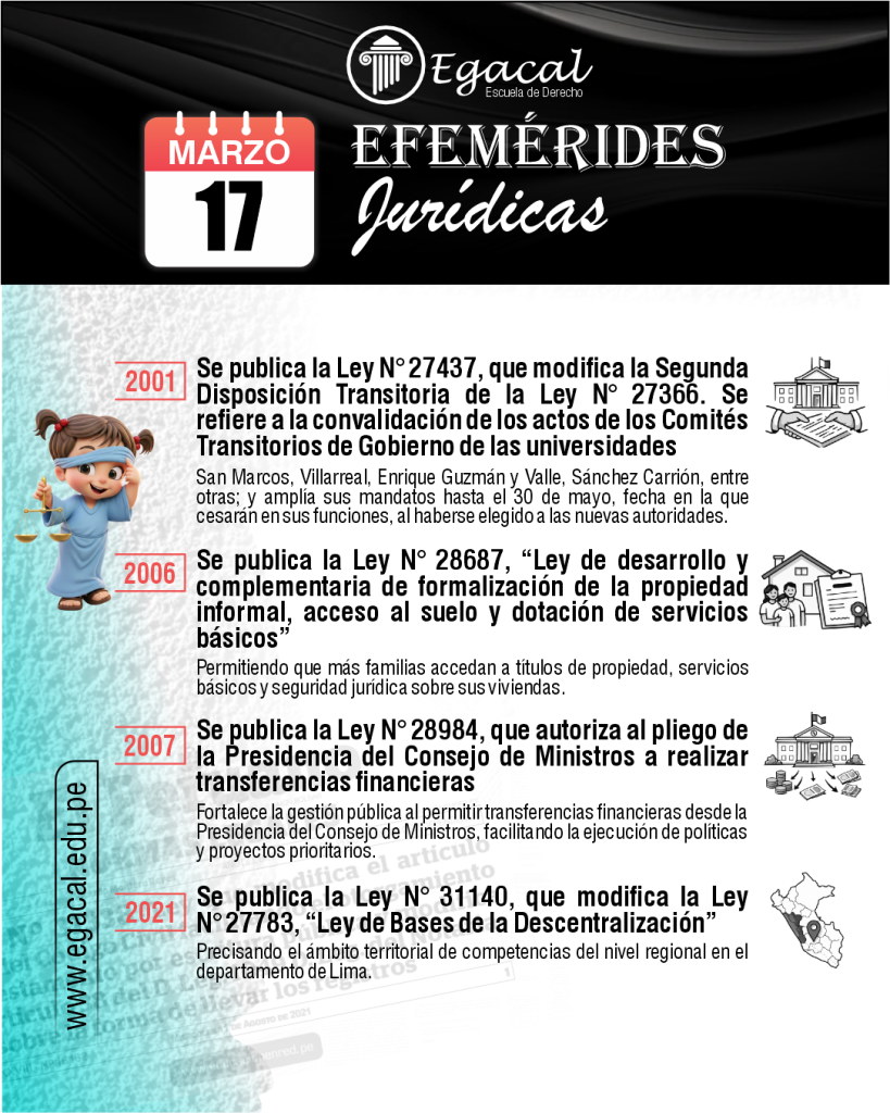 Se publica la Ley Nยฐ 27539, regula la elecciรณn de los jueces de paz no letrados. Facilitar el acceso a la justicia en zonas rurales, regulando la elecciรณn de jueces de paz sin formaciรณn legal pero cumplen funciones de justicia local.