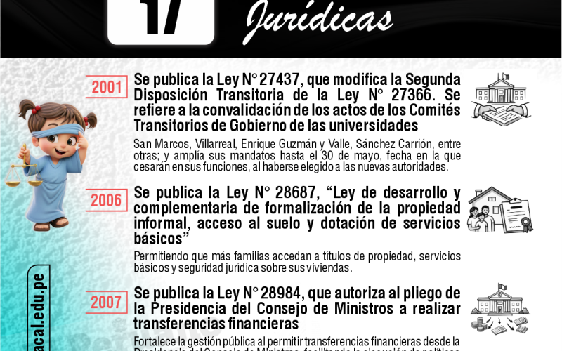 ๐ 2001: Se publica la Ley Nยฐ 27437, que modifica la Segunda Disposiciรณn Transitoria de la Ley Nยฐ 27366. Se refiere a la convalidaciรณn de los actos de los Comitรฉs Transitorios de Gobierno de las universidades: San Marcos, Villarreal, Enrique Guzmรกn y Valle, Sรกnchez Carriรณn, entre otras; y amplรญa sus mandatos hasta el 30 de mayo, fecha en la que cesarรกn en sus funciones, al haberse elegido a las nuevas autoridades.