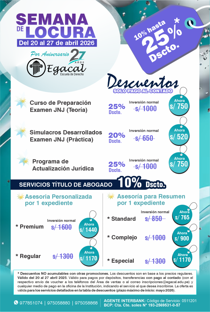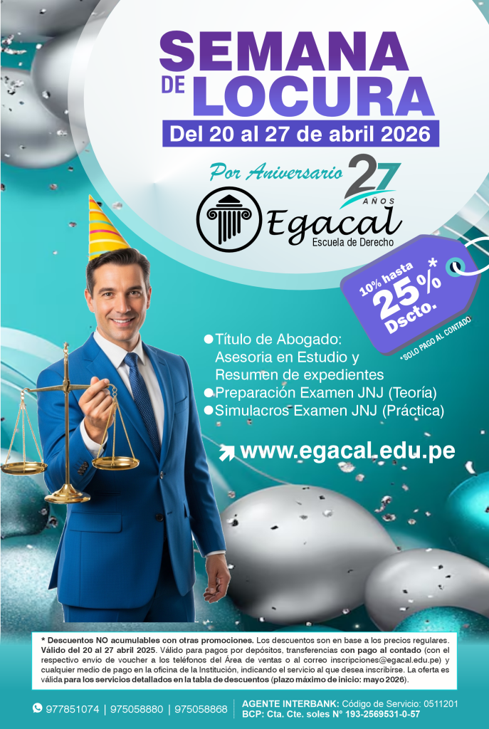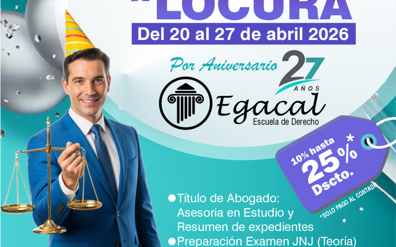 Egacal – Escuela de Derecho, por su 27° aniversario, agradece a la comunidad jurídica por la confianza en nuestra institución y en nuestras propuestas académicas. Por ello, presentamos la SEMANA DE LOCURA Egacal por su 27° aniversario. Ponemos a su disposición descuentos del 10% al 25% en Preparación Examen JNJ (Teoría) , Simulacros Desarrollados Examen JNJ (Práctica), Actualización Jurídica, Asesoría en estudio y en Resúmenes de expedientes para Título de Abogado.